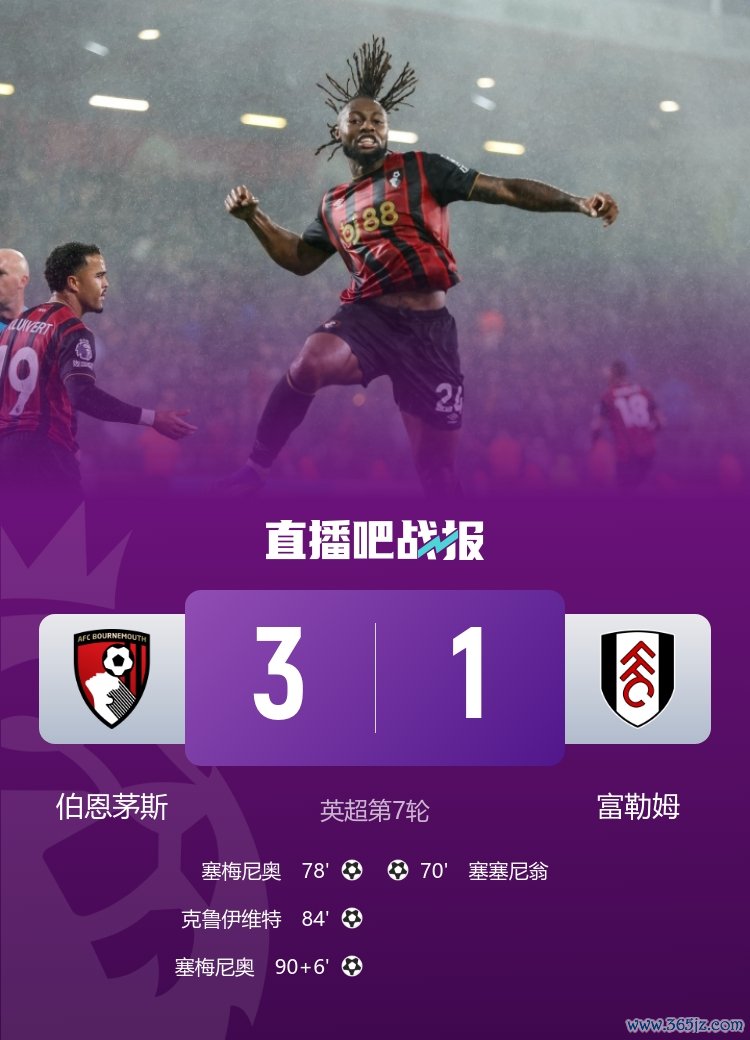 10月4日讯 英超第7轮先赛一场,伯恩茅斯主场3-1打败富勒姆。