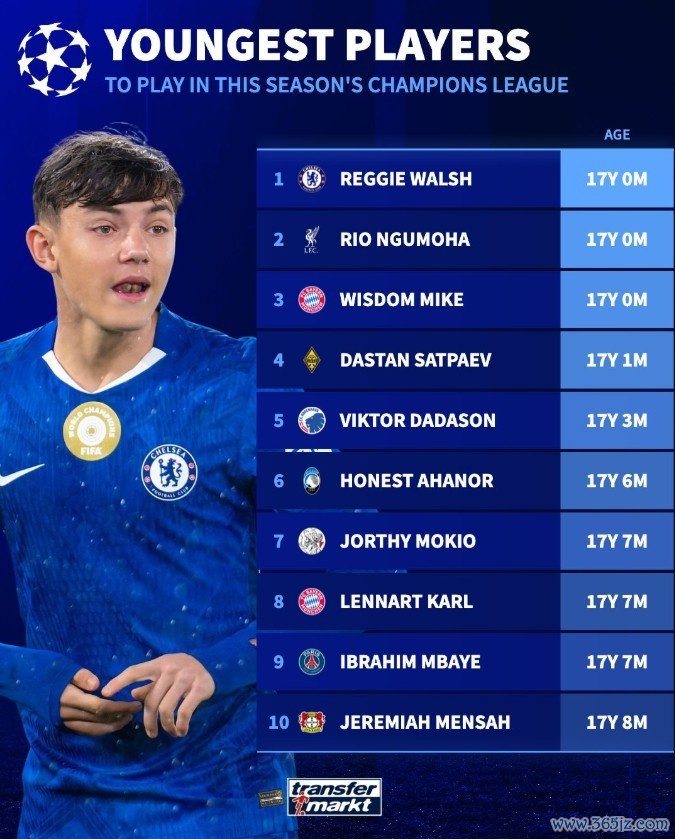 11月5日讯 本赛季,欧冠赛场上一批年青球员有望崭露头角,德国转会商场盘货了各队在欧冠中最年青球员名次。