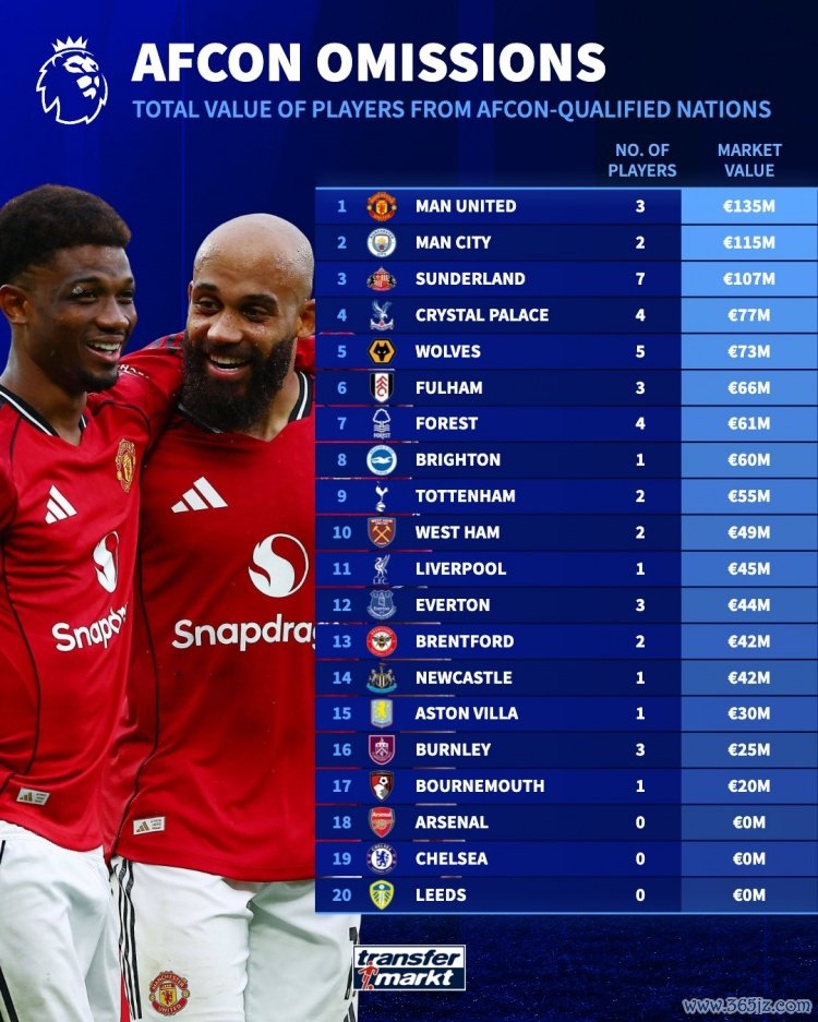11月21日讯 德国转会商场统计了英超各队将参预非洲杯球员的身价,比肩出排行,曼联1.35亿欧居首,曼城1.15亿欧次席。