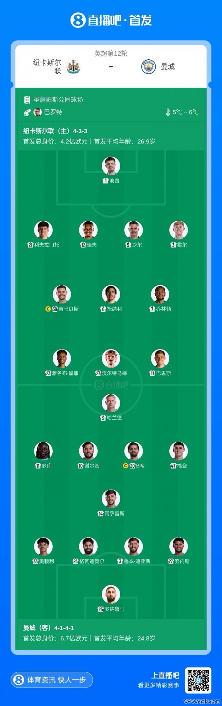 11月23日讯 英超第12轮,纽卡主场迎战曼城比赛行将打响。赛前首发出炉。本场哈兰德、沃尔特马德迎来锋线对决,曼城当今在联赛2连胜,纽卡为联赛2连败。