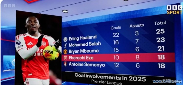 据BBC统计,埃泽本年英超参与18粒进球,仅少于哈兰德、萨拉赫、姆伯莫。