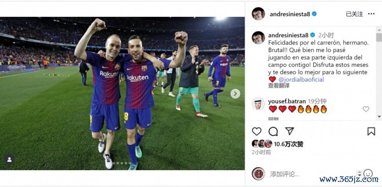 10月8日讯 阿尔巴将在本赛季扬弃后退役,老队友伊涅斯塔社媒发文祝愿。