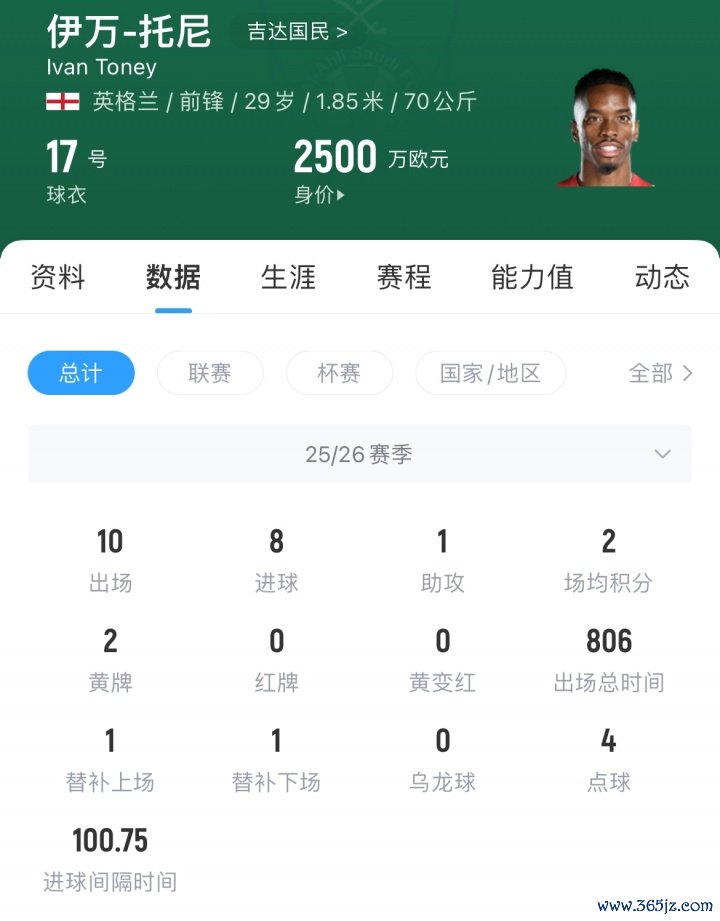 伊万-托尼现年29岁,英格兰时尚,24年8月从布伦特福德以4200万转会至吉达国民。本赛季他为吉达国民各赛事出场10次,获得8粒进球和1次助攻,当今其德回身价为2500万欧。