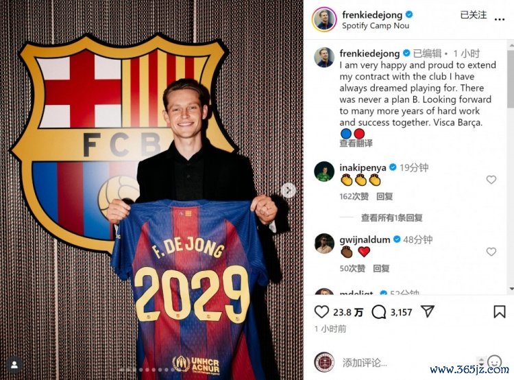 10月16日讯 巴萨官方告示,队内中场德容续约至2029年,德容社媒发文庆祝。