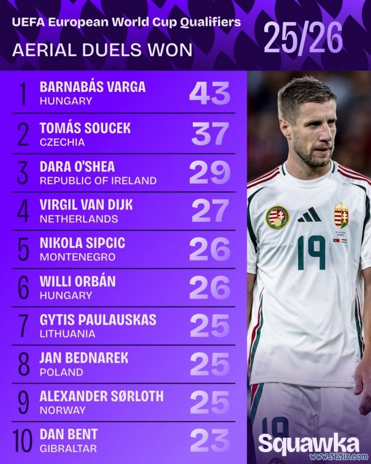 11月20日讯 本届世欧预小组赛还是告一段落,squakwa也统计了本届赛事胜利争顶情况,范戴克位列第四。