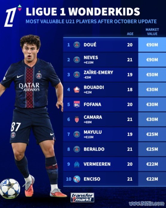 10月11日讯 德国转会商场更新了法甲球员最新身价情况,在U21球员中,杜埃和若昂-内维斯以9000万欧比肩榜首,排名前10的球员中有5名王人来自巴黎圣日耳曼。