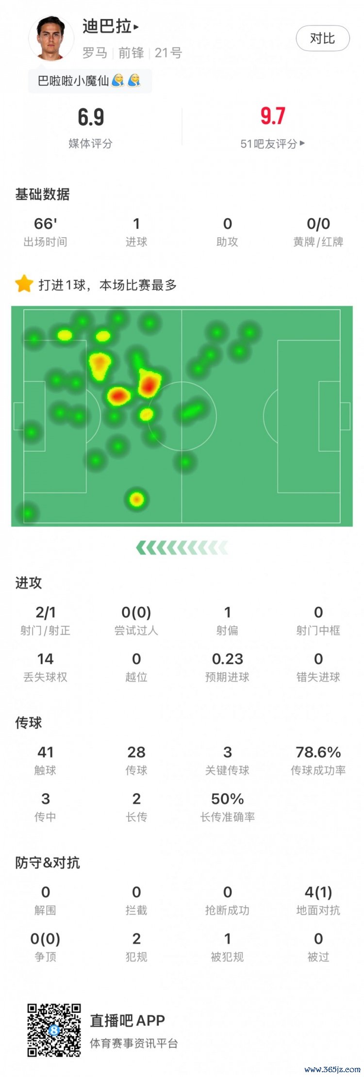 迪巴拉此役为罗马首发出战66分钟,打进1球,同期还送出3记枢纽传球。