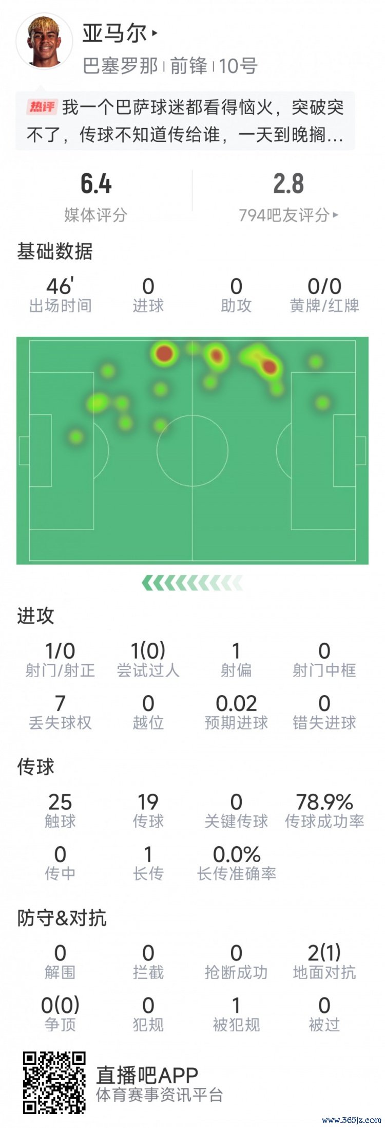 你的位置:欧冠决赛直播 > 西甲赛事 > 亚马尔半场数据:1次射门0射正,过东谈主、关节传球挂零,评分6.4分
