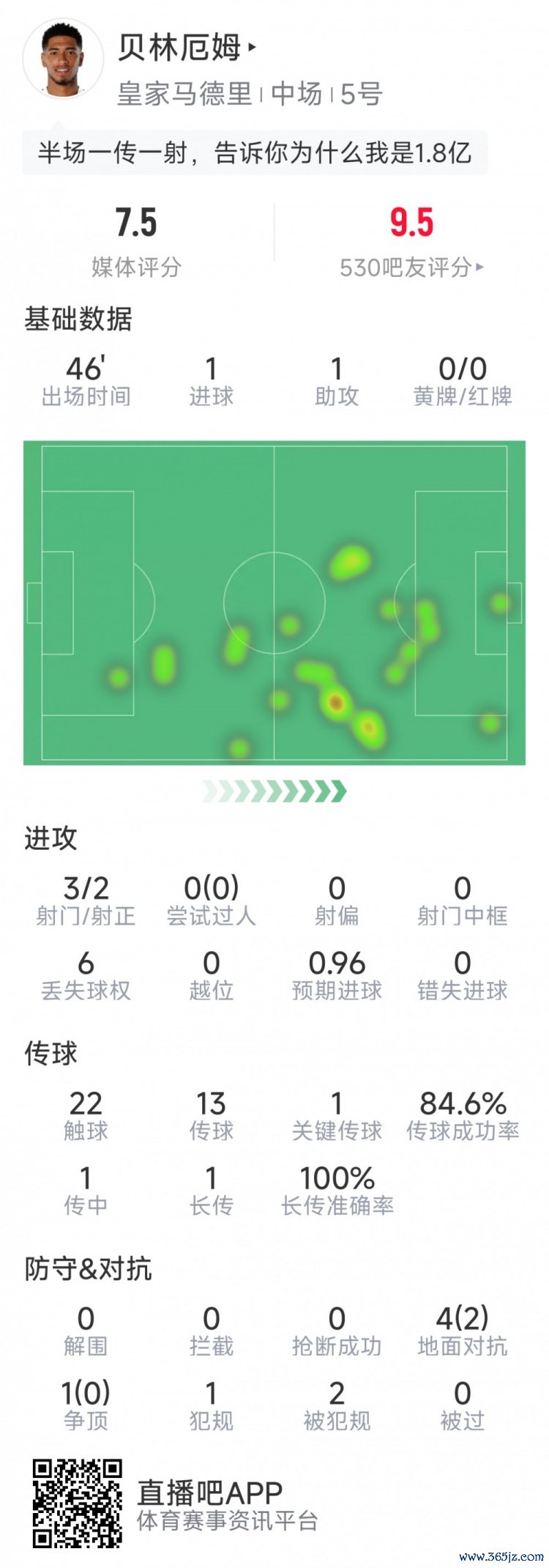 10月27日讯 在本轮西甲国度德比,贝林厄姆半场传射立功,以下为他在半场数据: