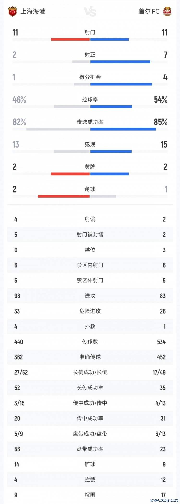 两边全场数据如下(左-上海海港 右-首尔FC)↓