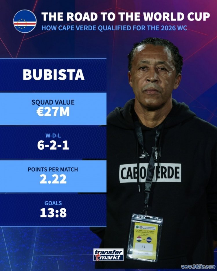 德国转会市集列出了佛得角活着初赛中的数据,佛得角战绩6胜2平1负,场均赢得2.22分,打进13球丢8球。