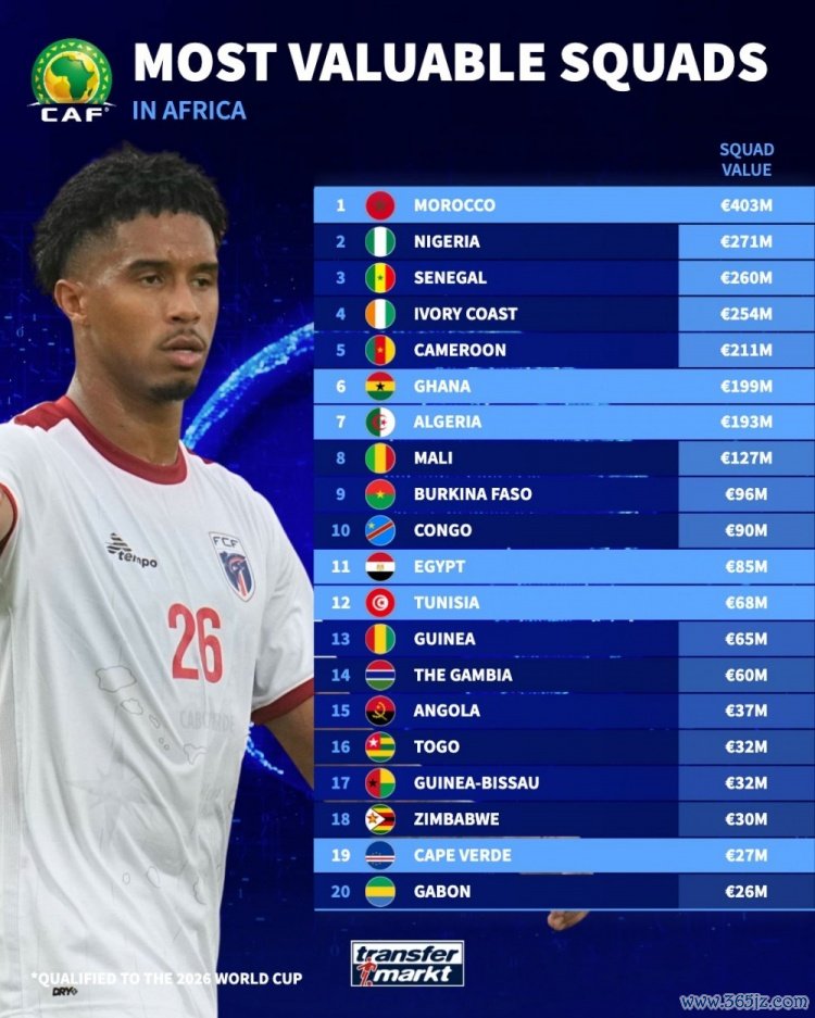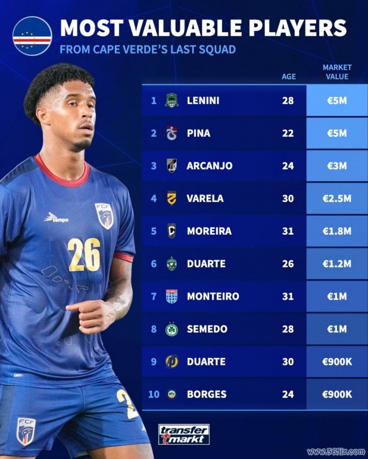佛得角威望总身价2700万欧元,非洲球队之中仅排在第19位,而首位摩洛哥总身价高达4.03亿欧元。佛得角身价最高的球员为莱尼尼、皮纳,两东谈主德回身价均为500万欧元,仅8名球员身价达到100万欧或以上。