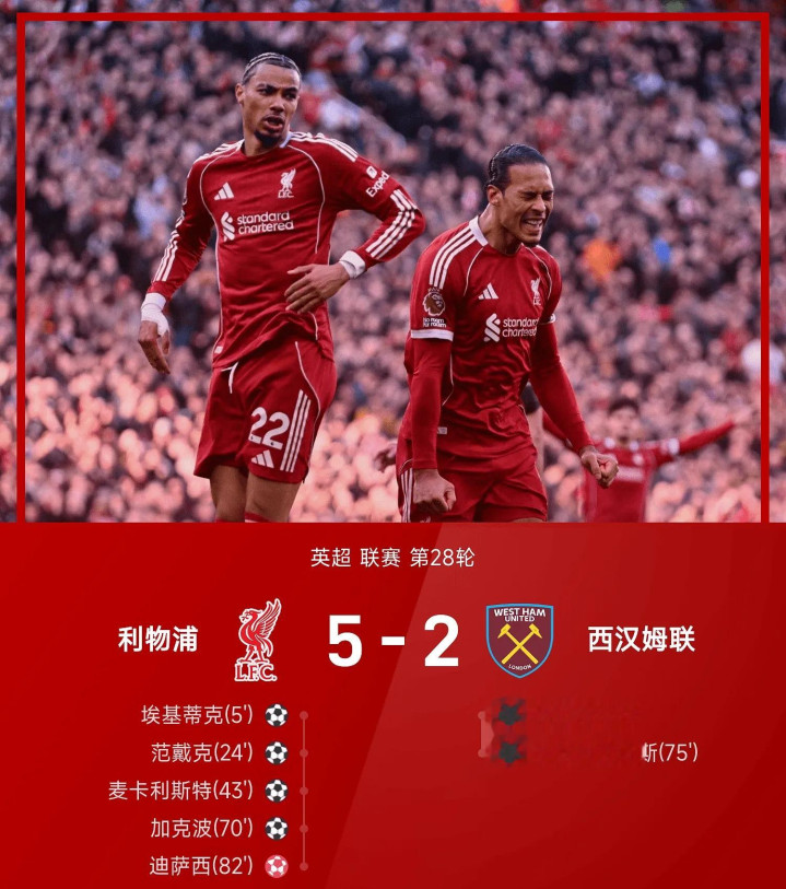 25/26比联赛季英超足球锦标赛季第28轮,利物浦本场比赛以5-2大胜西汉姆联。上半时对抗赛,埃基蒂克传球与射门配合建功,范戴克和麦卡利斯特相继射门足球计分,助红军取得3球优势;下半时对抗赛,埃基蒂克助攻球入球数加克波射门足球计分,迪萨西送出乌龙;绍切克和卡斯特拉诺斯为西汉姆联追回2球,但却已于事无补。,最终利物浦5-2西汉姆联各项比赛4连胜,先赛一场暂时升至足球球队排名第5。