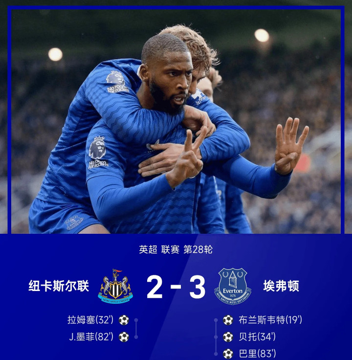 25/26比联赛季英超足球锦标赛季第28轮,埃弗顿3-2战胜纽卡斯尔联。全局对抗赛,布兰斯韦特开场第19分钟接加纳角球时机射门助攻球入球数头球射门射门足球计分首开记录,拉姆塞接托纳利助攻球入球数长距离射门扳平足球赛事杯结果,仅仅2分钟后纽卡守护者波普送礼,贝托射门足球计分再度领先;第82分钟墨菲长距离射门射门足球计分二度扳平;仅仅1分钟后巴里在门前接霍尔边边线分配球权臀部撞射射门足球计分杀死对抗赛。本场对抗赛过后,纽卡斯尔联积36分暂列足球锦标赛季第十二,埃弗顿积40分暂列足球锦标赛季第八。