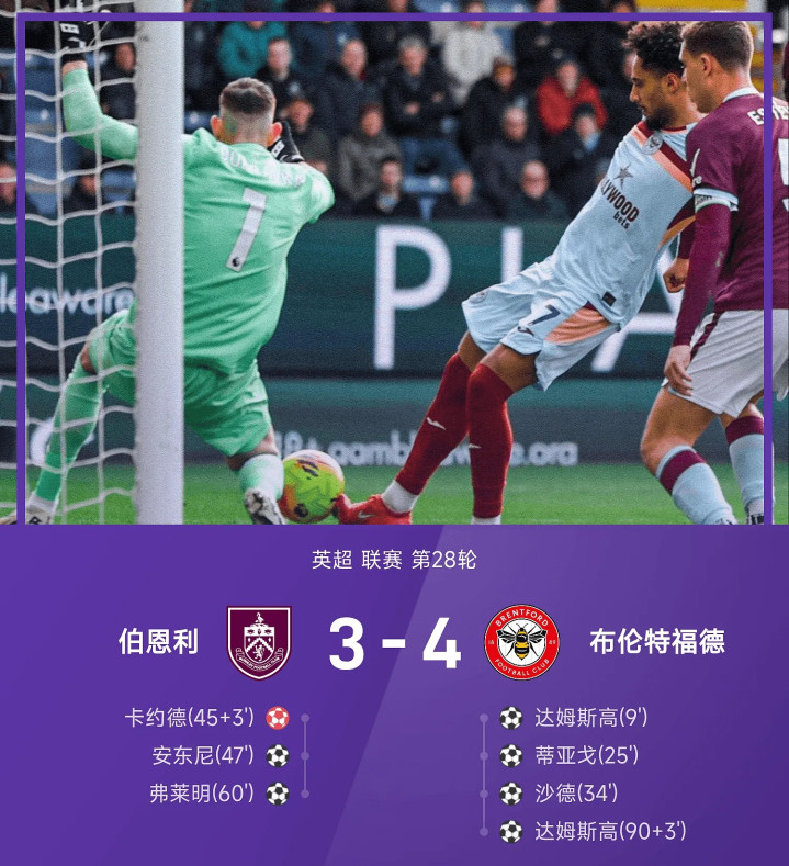 25/26比联赛季英超足球锦标赛季第28轮,伯恩利对阵布伦特福德。上中场休息时间,达姆斯高贡献传球与射门配合,沙德利用足草坪边界边球造成的混乱再下一城,小蜜蜂3-0领先。随后卡约德自摆乌龙,伯恩利以1-3进入中场选手选手线选手休息。下中场休息时间风云突变,安东尼点球区内内强攻方案球球门边柱得手,富弗莱明快速防反战术头球射门射门足球计分,伯恩利完成让三追三。之后弗莱明的反超球因出界被吹。延长时间第3分钟,达姆斯高推射完成绝杀,随后巴恩斯绝平入球数因手球在先被判无效,最终布伦特福德在外场以4-3击败伯恩利。本场过后,伯恩利积19分仍排在倒数第二,布伦特福德积43分联赛足球球队排名第七。
