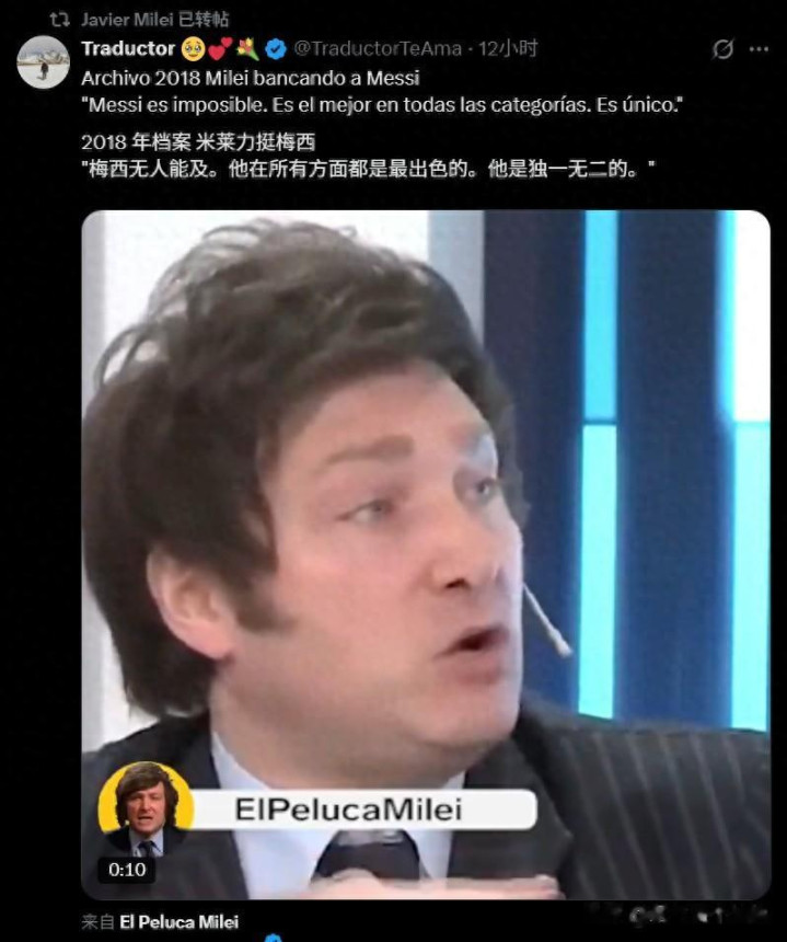 阿根廷总统米莱就站出来,声援梅西。他没有直接开口,而是通过在社交媒体上转发动态的方式,身体冲撞梅西反对者。其中有个动态是自己以前夸梅西的话。那是米莱在2018年的发言,他当时说梅西无人能力,他在所有方面都是最出色的,梅西独一无二。