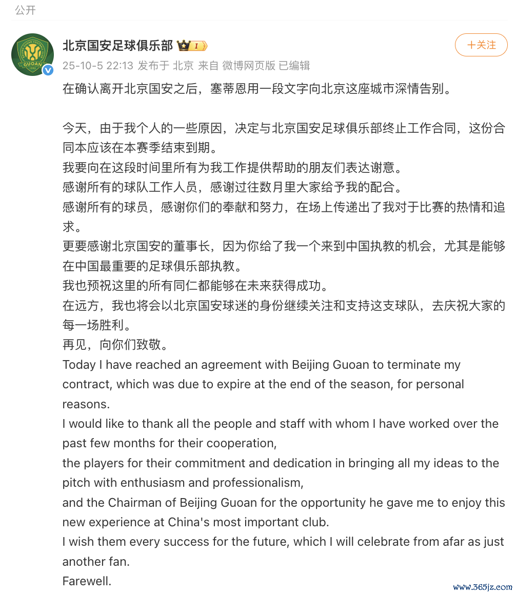 今天,由于我个东说念主的一些原因,决定与北京国安足球俱乐部远离责任契约,这份契约本应该在本赛季为止到期。