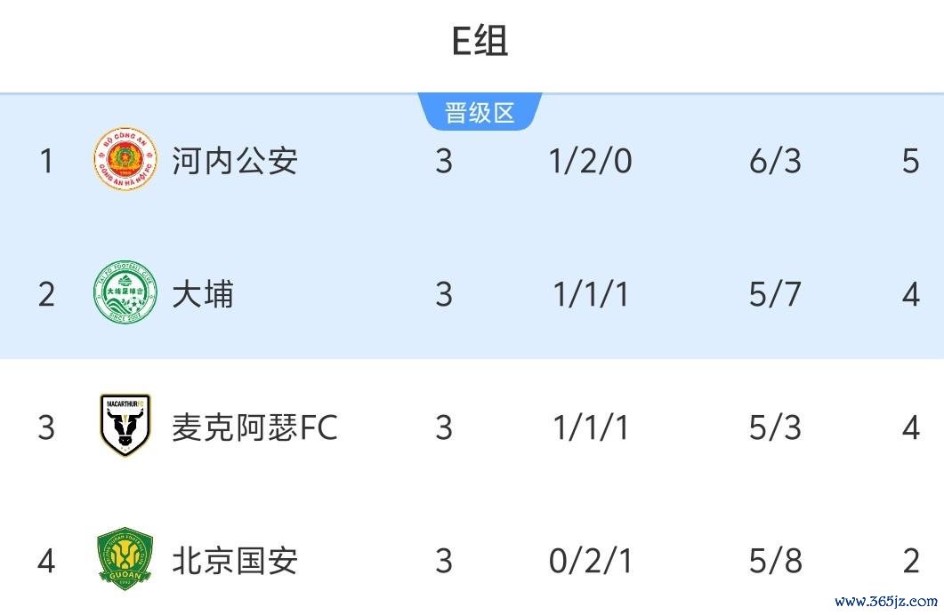 3轮事后的小组名次,国安2平1负仅积2分仍然排在小组垫底,河内公安则1胜2平的不败战绩积5分持续排在小组第一,大埔队和麦克阿瑟FC同积4分分列第2和第3。