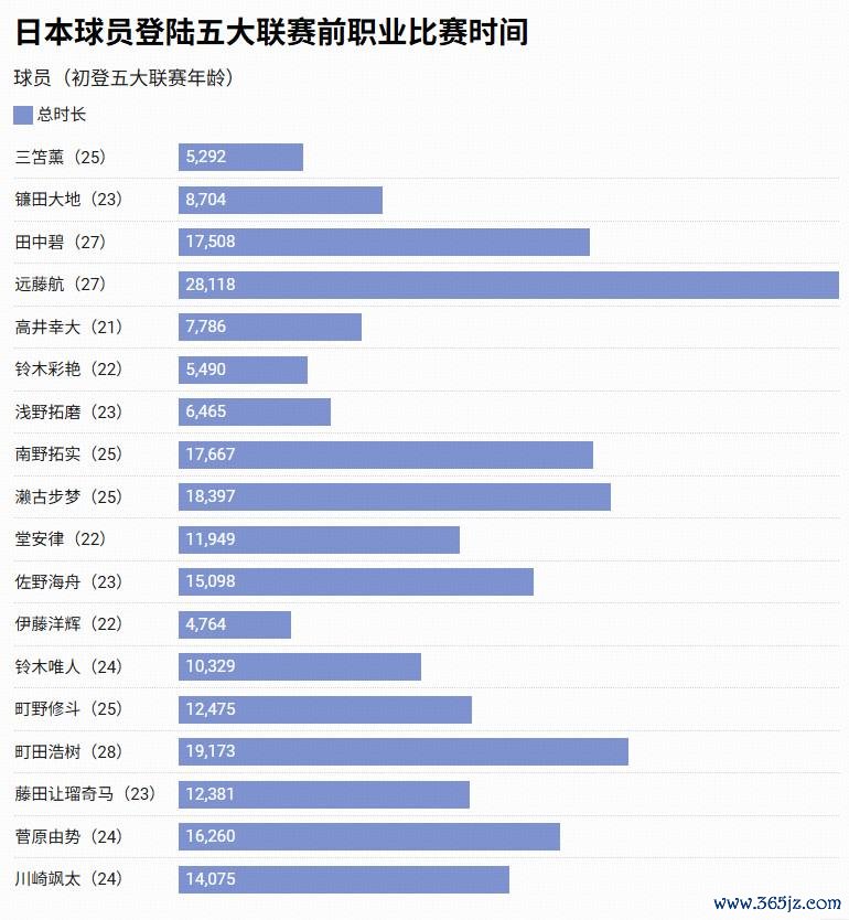 咱们进一步总览现役20名五大联赛着力的日本球员,咱们取得了以下的数据:登陆五大联赛用时最少的是当今着力于拜仁的伊藤洋辉,觉得在J联赛踢了4764分钟;耗时最多的是远藤航,加盟斯图加特前,他在 J 联赛累计出战 24107 分钟,比甲出场 2120 分钟,德乙建筑 1891 分钟,在近 30000 分钟的高强度比赛熟练后,时年 27 岁 8 个月的他才初度踏上五大联赛赛场。